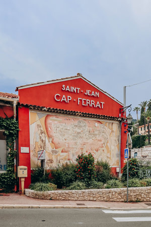 Saint-Jean-Cap-Ferrat, France - 01 June 2023: Beautiful painted facade of the building at the entrance to the peninsula of Saint Jean Cap Ferrat
