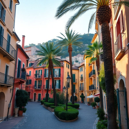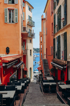 Villefranche sur Mer, France - 01 June 2023: Beautiful bright orange and red facades in the city center of Villefranche sur Mer, on the French Riviera