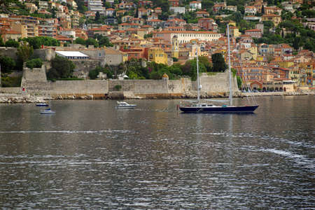 Villefranche-sur-mer, France - July 06, 2009: Seaside town situated on the French Riviera, Cote d'Azur. Residential buildings located on a hillside just on a Mediterranean bay