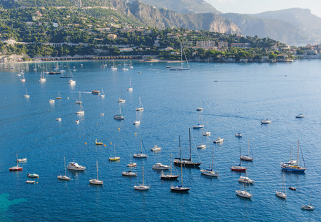 Yachts at anchor in natural harbor of Villefranche-sur-Mer on sunny summer afternoon.