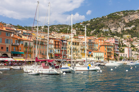 VILLEFRANCHESURMER FRANCE OCTOBER 1 2014: Colorful waterfront of picturesque French Riviera town with leisure boats anchored in harbor.