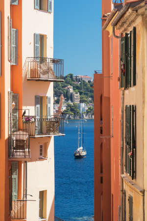 Old narrow authentic street of the city of Villefranche-sur-Mer in the French Riviera resort. View of the sea and yacht. Journey along the Cote d'Azur.