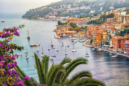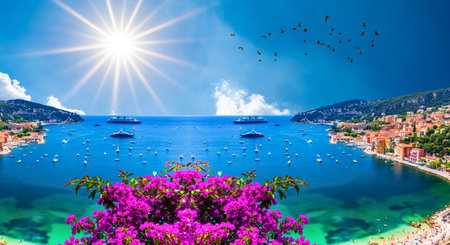 Bougainvillea blossom framing an aerial view of French Riviera coast in picturesque medieval seaside Villefranche sur Mer, South of France