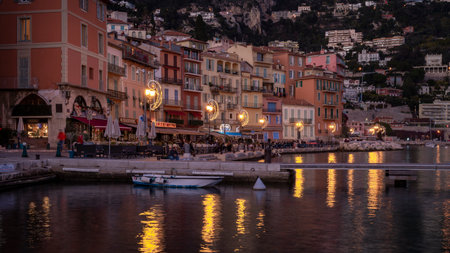 The picturesque port of Villefranche-sur-Mer on the French Riviera with its colorful facades facing the sea photographed at dusk