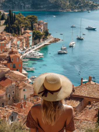 A woman in a wide-brimmed hat gazes over a charming seaside village, where vibrant terracotta rooftops meet sparkling turquoise waters bustling with sailboats under a cle
