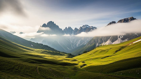 Dramatic showing dramatic mountain peaks piercing through soft white clouds in a valley with rolling green hills and a winding path under a bright...