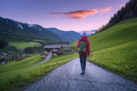 Beautiful young woman with backpack is standing on the mountain road at sunset in autumn. Landscape with sporty girl, rural road, green meadow, trees, purple sky in Italy at dusk in fall. Travel