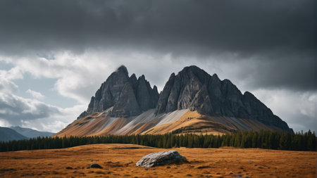 A captivating landscape showcasing towering mountain peaks shrouded in dark clouds, contrasted by a lush green valley below, evoking a sense of adventure and tranquility.