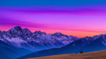 A breathtaking mountain range at sunrise with snow-capped peaks and a serene blue sky