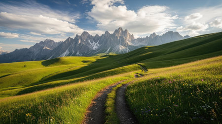 Trail through a green meadow leading to Dolomite mountains of norhern Italy