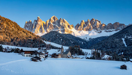 snow-covered chapel surrounded by towering peaks and untouched snow in winter, created with generative ai