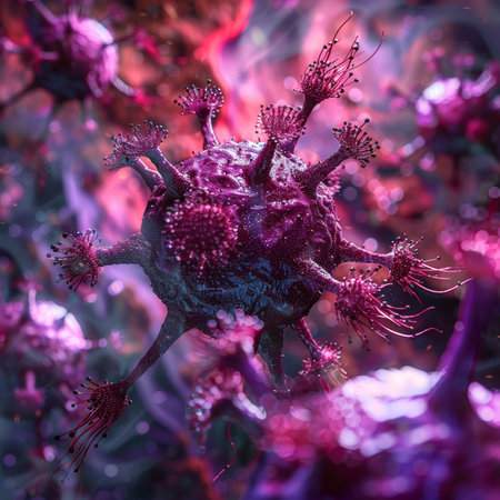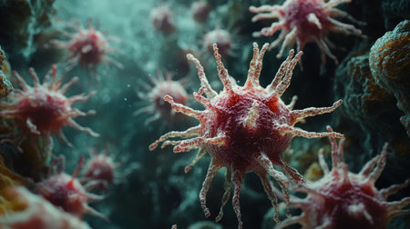 Close up of bacteria and virus cells in lab setting with vibrant blurred background