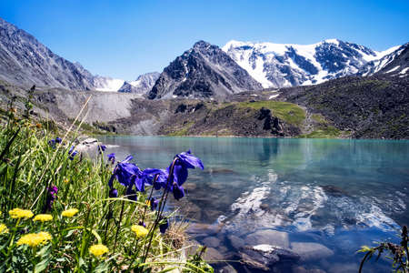 Small mountain lake with blooming flowers on foreground.Beautiful summer landscape of the Altai mountains and lakes with blooming flowers. mountain peaks are reflected in the crystal clear water lake