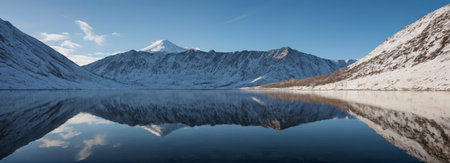 Tranquil winter scene unfolds with snow covered and towering mountains against a crisp blue sky. Minimalistic background for social media post or smartphone wallpaper