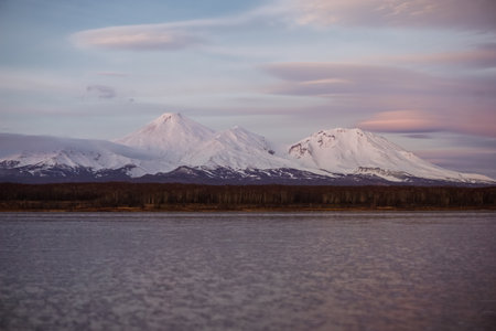Panorama volcano landscape of Kamchatka Peninsula. Domestic Volcanoes. Avachinskiy, Koryaksky, Kozelsky volcanoes