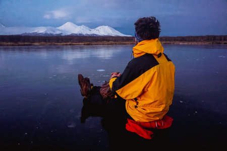 A Man on a Frozen Lake with a View of Kamchatka Volcanoes at sunset