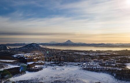 twilight over Avacha Bay near Petropavlovsk-Kamchatsky city from Mishennaya sopka in spring evening, Kamchatka Krai, Russia