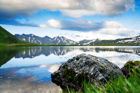 Volcanic landscape with green plains and lake on Kamchatka peninsula, Russia
