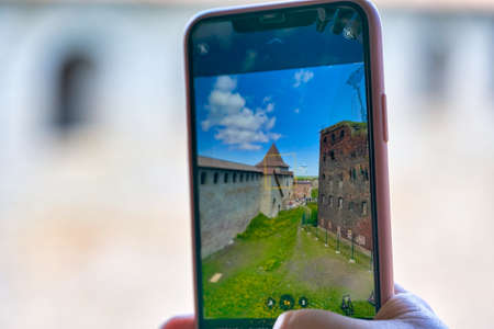 Taking a photo on a smartphone while traveling. Fortress Oreshek