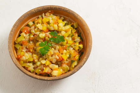 Stewed colorful vegetables in a ceramic bowl with a sprig of parsley. Spanish cuisine concept. Pisto manchego. Top view. Copy spase.