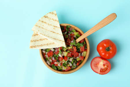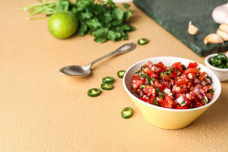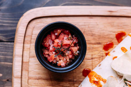 Traditional Mexican Pico de Gallo sauce in bowl on wooden table