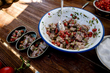 CHILEAN SALMON SEVICHE. Fresh raw salmon marinaded with purple onion, coriander in lemon juice ..