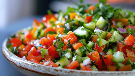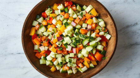 A vibrant bowl of fresh vegetable salad showcasing an array of colorful diced veggies, perfect for healthy meals and culinary presentations.