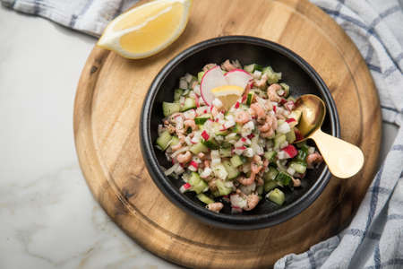 German Friesland north sea brown shrimps salad in bowl with cucumber, red radish, dill and lemon on wooden board