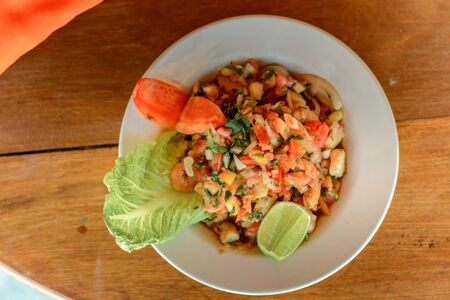 Peruvian ceviche is a traditional dish consumed in Peru. The preparation method is different from other places, using lemon, fish, potatoes, onion, seaweed, corn, chili, ginger, milk, sweet potato.