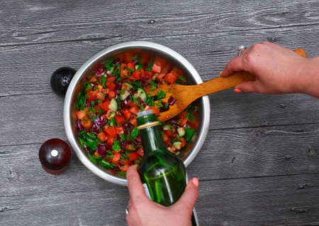 Womens hands interfere with vegetable salad and seasoned it with olive oil