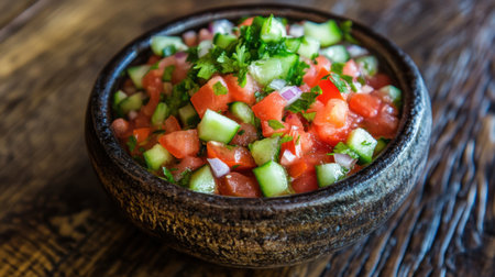 A rustic bowl filled with fresh salsa showcasing vibrant tomatoes, cucumbers, and herbs, perfect for enhancing meals or as a healthy snack.