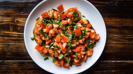 An appetizing plate of fresh tomato bruschetta topped with herbs and garlic. This vibrant dish is perfect for appetizers or summer dining.