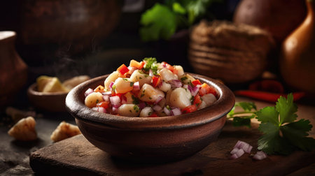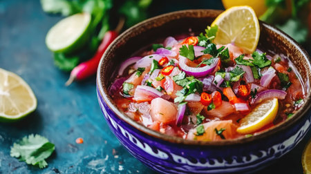 Discover a vibrant bowl of traditional ceviche featuring fresh fish, tangy lime, and colorful vegetables, perfect for a refreshing appetizer or light meal.