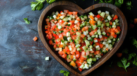 A vibrant display of freshly chopped vegetables arranged in a heart-shaped bowl, perfect for healthy meals or colorful salads. Ideal for showcasing fresh ingredients.