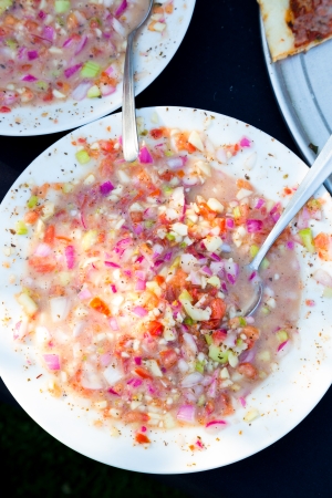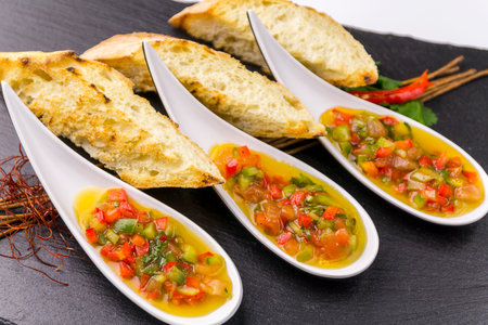 Gazpacho, traditional mexican cold tomato soup with ciabatta bread