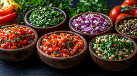 A vibrant assortment of fresh herbs and spices arranged in rustic bowls, showcasing culinary diversity and bold flavors.
