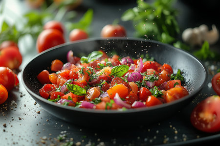 Fresh tomato salad with onion and basil in black bowl, closeup