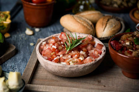 closeup of a tomato salad served on a rustic bowl on a gray rustic table next to some plates and bowls with other vegetarian ingredients and side dishes, and some bread buns