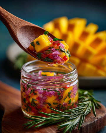 Close-up of a wooden spoon lifting mango delight from a glass jar, featuring vibrant mango chunks, red onion, and herbs on a dark wooden board.