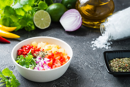 Freshly made mix of ingredients for salsa: pineapple, chili pepper, lime, red onion, spices, mint. Mexican cuisine concept on dark background