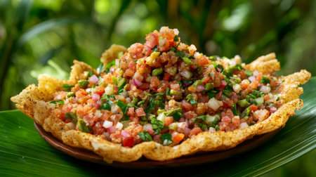 A vibrant and colorful bowl filled with fresh salsa made from assorted vegetables and herbs, served in a crispy tortilla bowl, ideal for festive gatherings.