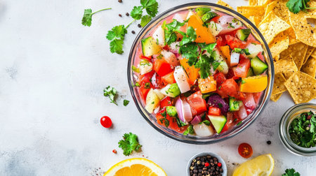 Fresh pickle de gallo in glass bowl, featuring vibrant diced pickles, tomatoes, onions, and cilantro, served with tortilla chip. Set on modern green gradient backdrop. Concept of bold flavor fusion