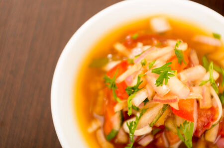 Tomato salad has cucumber coriander in bowl isolated on white wood background close up, top view, healthy vegetable food concept.