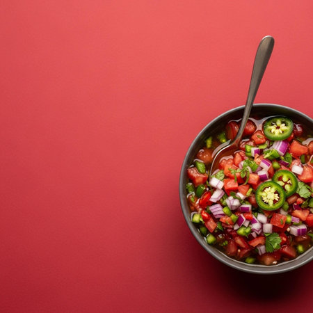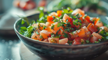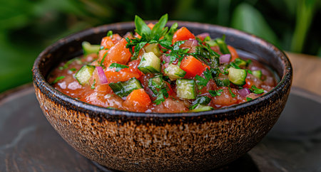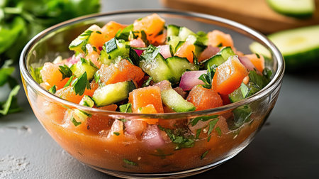 A Fresh gazpacho with diced vegetables in bowl, vibrant and healthy