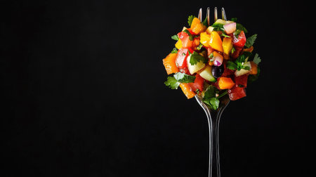A vibrant salad filled with fresh vegetables and herbs displayed on a fork. The combination of colors creates an appealing presentation against a dark background.