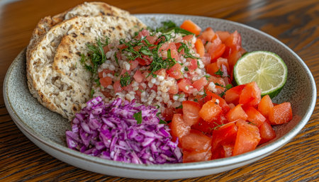Fresh and Vibrant Salad Bowl with Tabbouleh, Grilled Pita Bread, and Citrus, Healthy Eating