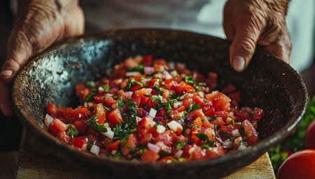 Hands Holding Rustic Bowl Filled with Fresh, Colorful Salsa, Celebrating Summer Flavors