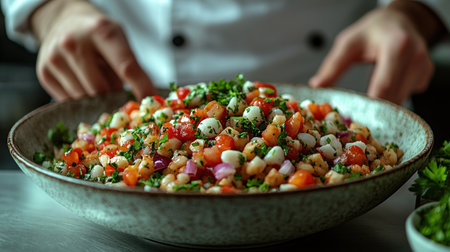 Fresh ingredients come together as a chef mixes a colorful salad bursting with flavor.