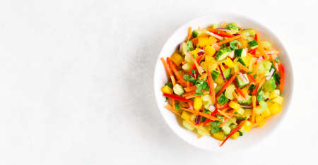 Healthy vegetable salad from bell pepper, cucumber, carrot, celery, greens in bowl over light stone background with free text space. Organic natural or vegetarian vegan food concept. Top view, flat lay