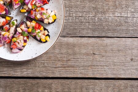 Spicy salad of baked eggplant, peppers and tomatoes. Eggplant caviar. Village ratatouille.